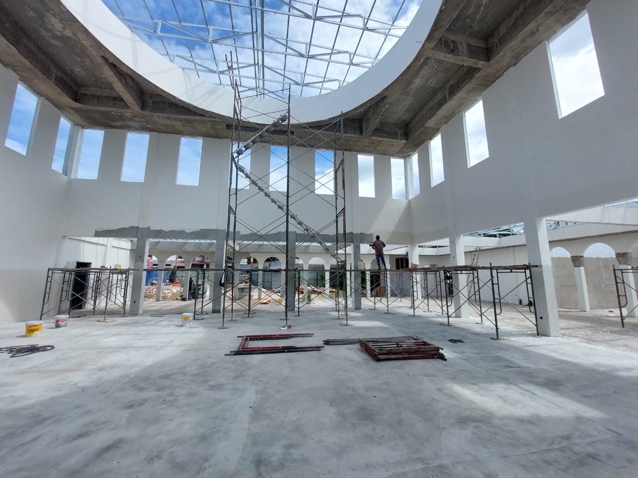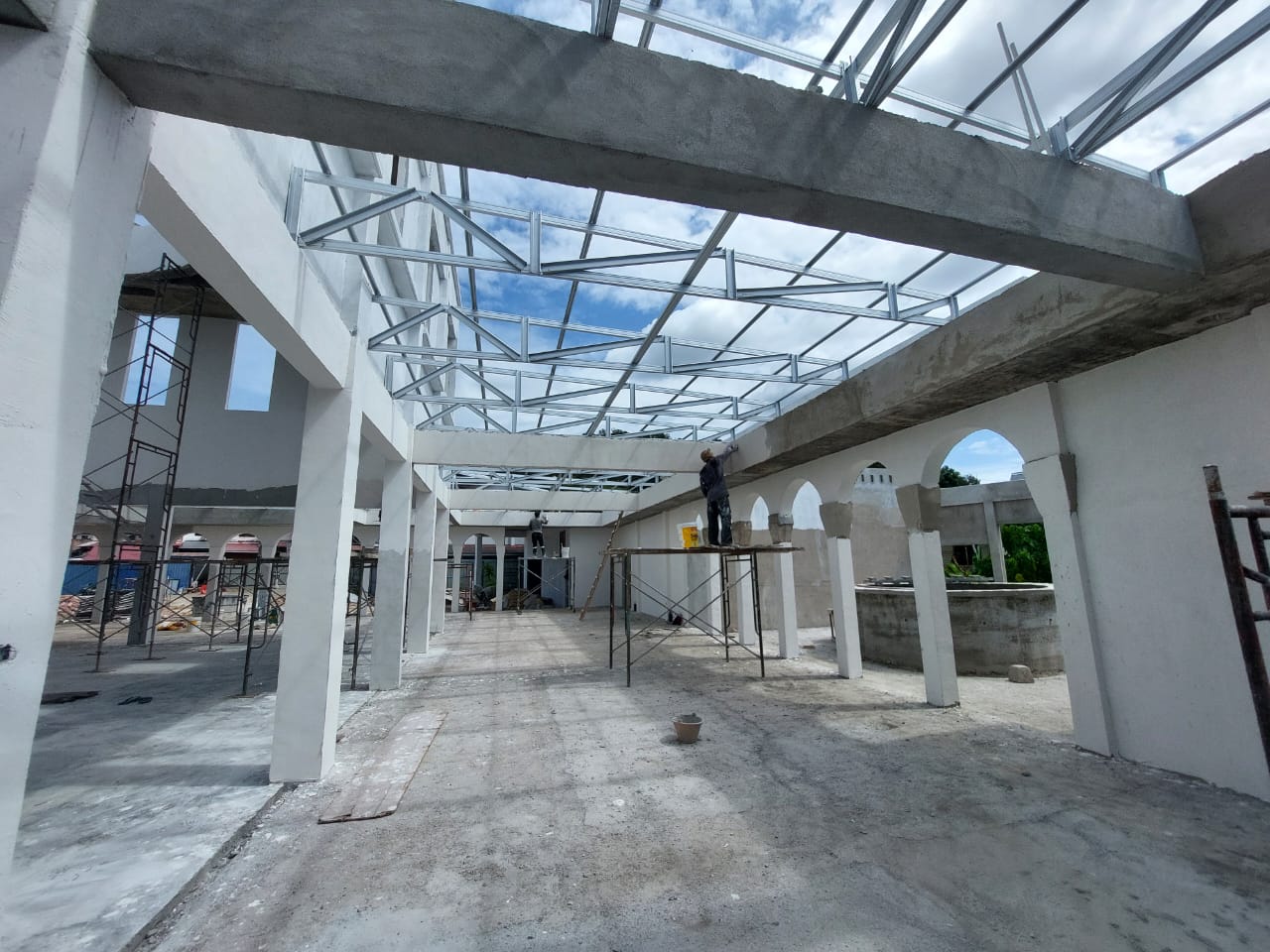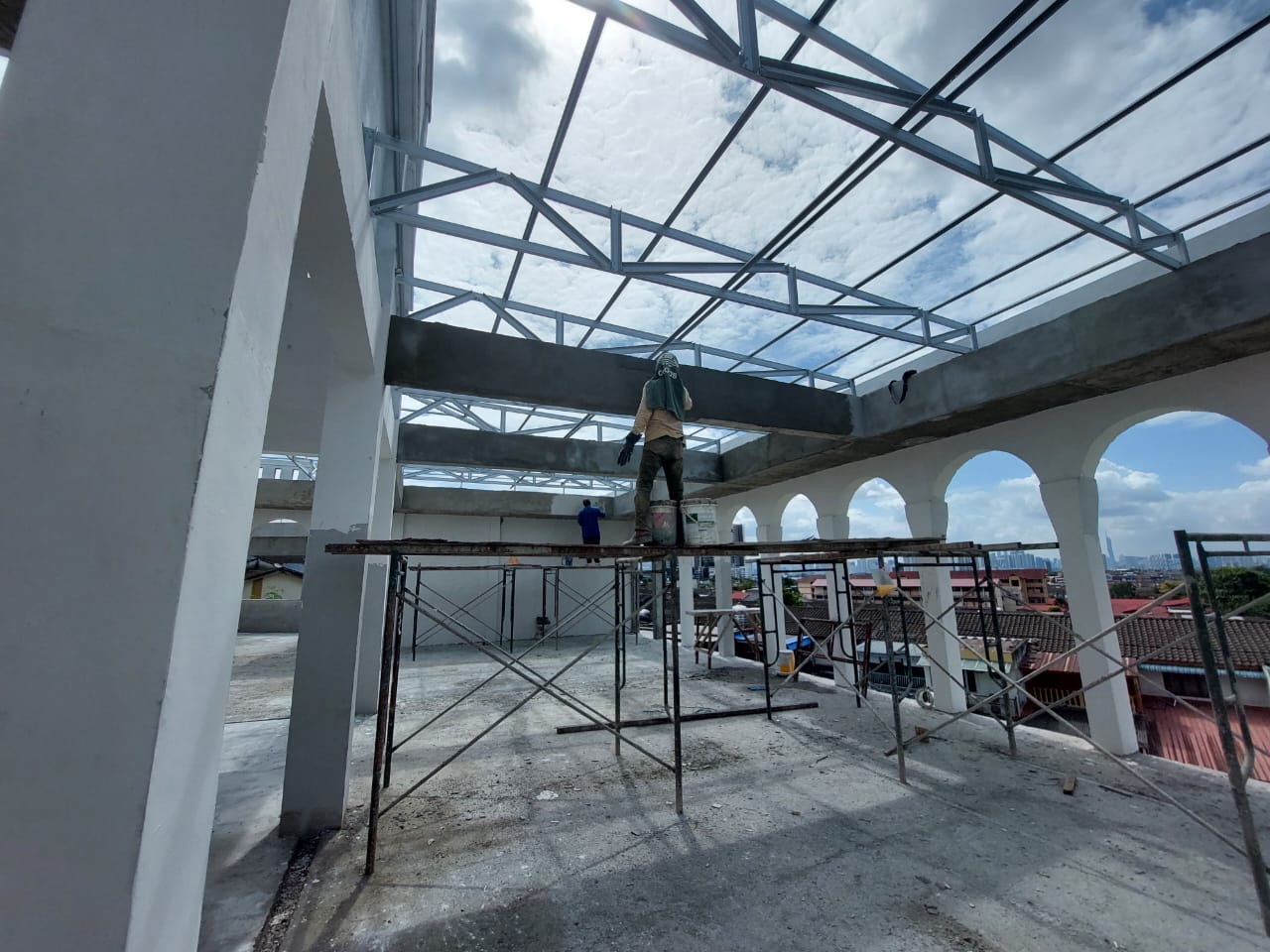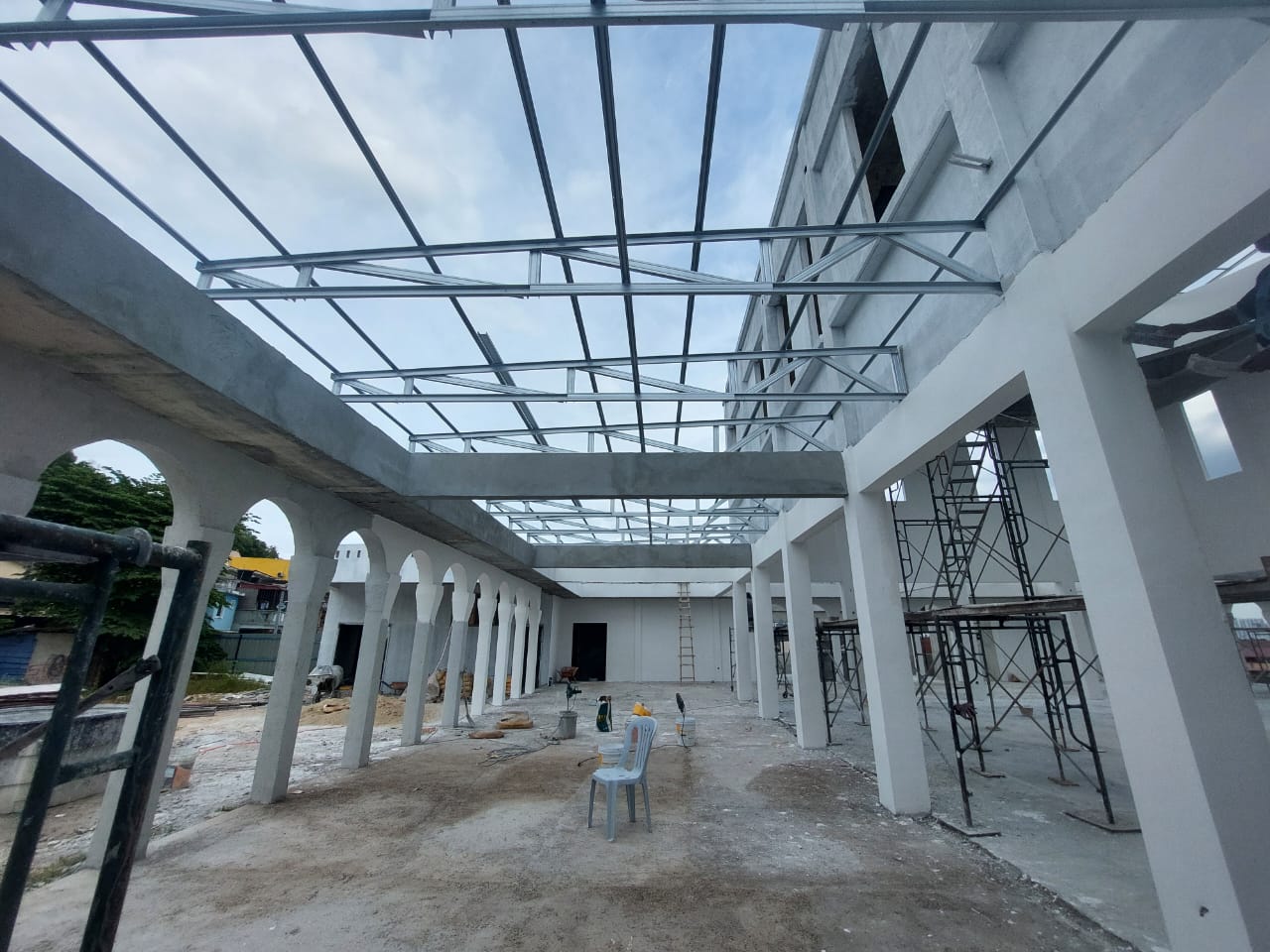 Tapak pembinaan masjid kini berada pada fasa struktur utama, di mana kerja-kerja pembinaan tiang konkrit dan rasuk telah disiapkan sepenuhnya. Perancah logam masih dipasang bagi menyokong struktur slab bumbung yang sedang dibentuk, manakala bahan binaan seperti papan acuan dan kayu disusun di sekitar kawasan kerja. Aktiviti di tapak menunjukkan kemajuan yang tersusun dan teratur, dengan kerja-kerja pembinaan diteruskan mengikut perancangan.